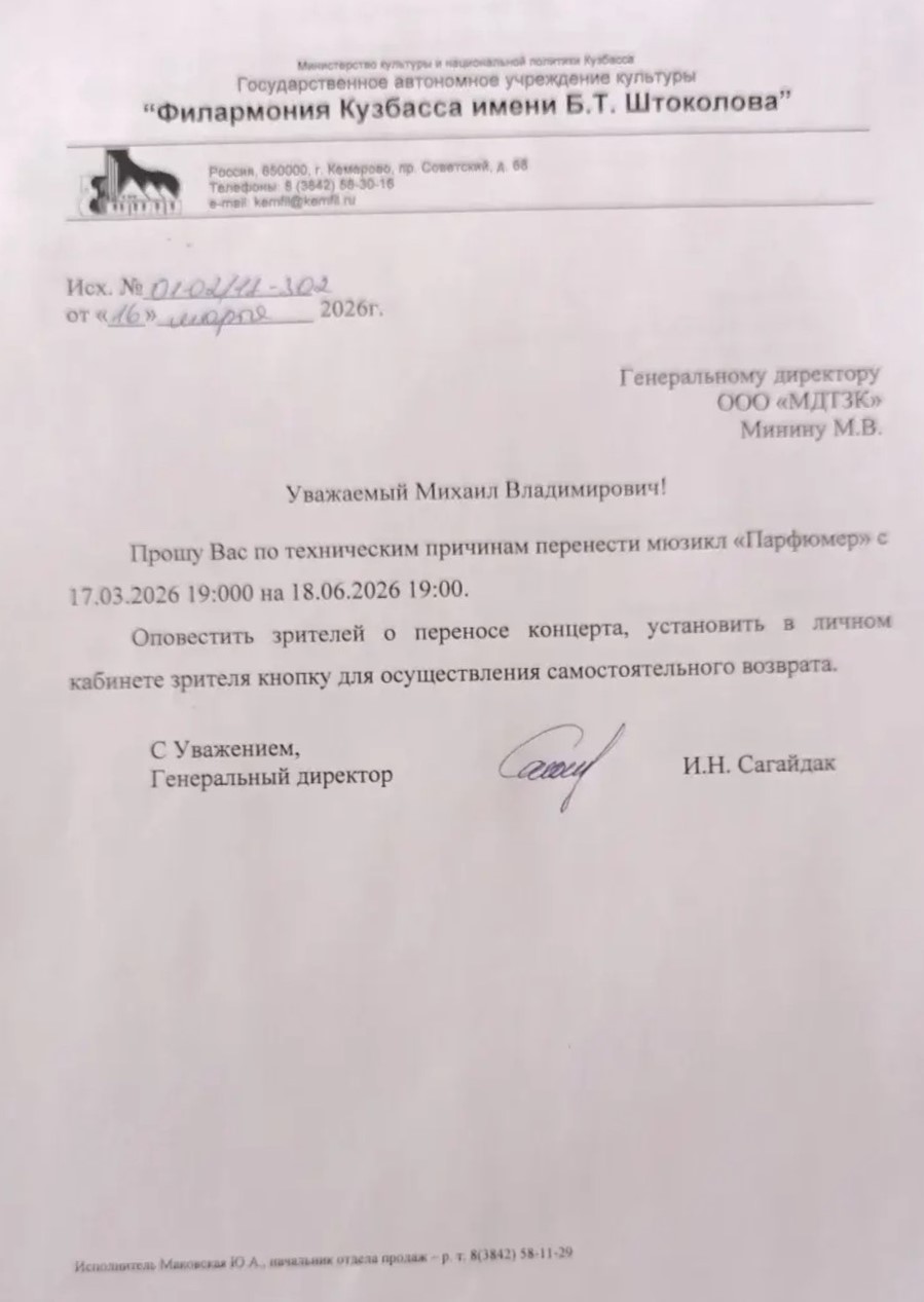 Уважаемый клиент! Спешим сообщить, что по информации, полученной от организатора, мюзикл «Парфюмер», запланированный на 17 марта 2026 года в 19:00 в Филармонии Кузбасса, перенесён на 18 июня 2026 года, начало в 19:00. Ранее приобретенные билеты действительны на новую дату, обменивать их не нужно. Если вам не удобно посетить мюзикл в новую дату, вы можете вернуть билет по кнопке в личном кабинете во вкладке «Заказы» (до 31 мая 2026 года включительно). Деньги за электронные билеты вернутся автоматически в полном объёме на карту, с которой была произведена оплата. Если вы купили билет в кассе Ticketland.ru за наличный расчет, то обратитесь, пожалуйста, на почту: vozvrat@ticketland.ru. С уважением, команда поддержки Ticketland.