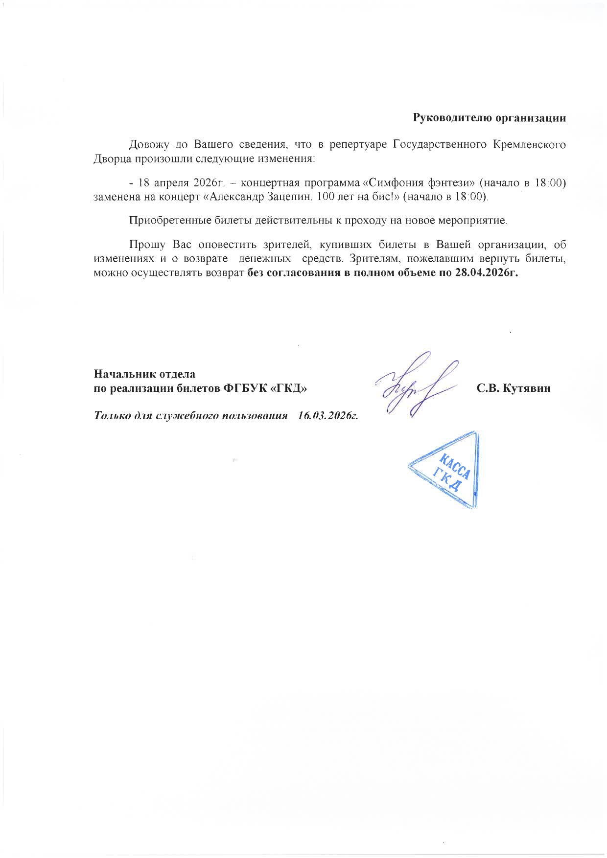 Уважаемый клиент! Спешим сообщить, что по информации, полученной от организатора, концертная программа симфонического оркестра «Симфония фэнтези», запланированный на 18 апреля 2026 года 18:00 в Кремле, заменена на концерт Александра Зацепина «100 лет на бис!», начало в 18:00. Ранее приобретенные билеты действительны на новое время, обменивать их не нужно. Если вам не удобно посетить концерт в новое время, вы можете вернуть билет по кнопке в личном кабинете во вкладке «Заказы». Деньги за электронные билеты вернутся автоматически в полном объёме на карту, с которой была произведена оплата. Если вы купили билет в кассе Ticketland.ru за наличный расчет, то обратитесь, пожалуйста, на почту: vozvrat@ticketland.ru. С уважением, команда поддержки Ticketland