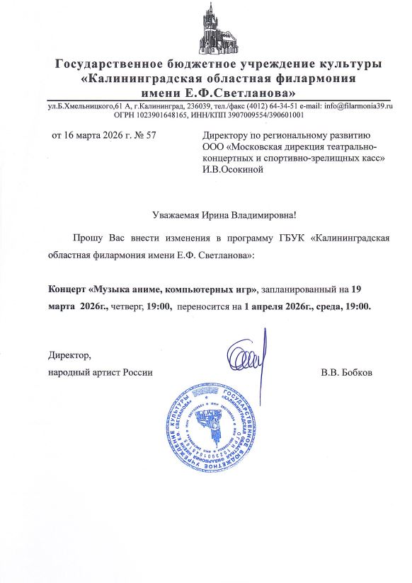 Уважаемый клиент! Спешим сообщить, что по информации, полученной от организатора, концерт «Музыка аниме, компьютерных игр. МАИС Аб. №2», запланированный на 19 марта 2026 года в 19:00 в Калининградской областной филармонии им. Е.Ф. Светланова, перенесён на 1 апреля 2026 года, начало в 19:00. Ранее приобретенные билеты действительны на новую дату, обменивать их не нужно. Если вам не удобно посетить концерт в новую дату, вы можете вернуть билет по кнопке в личном кабинете во вкладке «Заказы». Деньги за электронные билеты вернутся автоматически в полном объёме на карту, с которой была произведена оплата. Если вы купили билет в кассе Ticketland.ru за наличный расчет, то обратитесь, пожалуйста, на почту: vozvrat@ticketland.ru. С уважением, команда поддержки Ticketland.