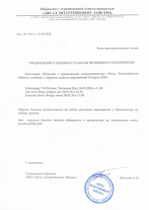 Уважаемый клиент! Спешим сообщить, что по информации, полученной от организатора, шоу «Капитан Немо: Вокруг света», запланированное на 28 марта 2026 года в 17:00 в ZooDepo, перенесён. Организатор предлагает обменять билеты на любой другой удобный сеанс или посетить другое событие организатора. По всем вопросам обмена или возврата билетов обращайтесь, пожалуйста, к организатору по электронной почте: perenos@bilet.club. К письму организатору обязательно приложите файлы ваших билетов и пожелания для переноса или обмена. В ответ организатор направит вам новые билеты. С уважением, команда поддержки Ticketland.