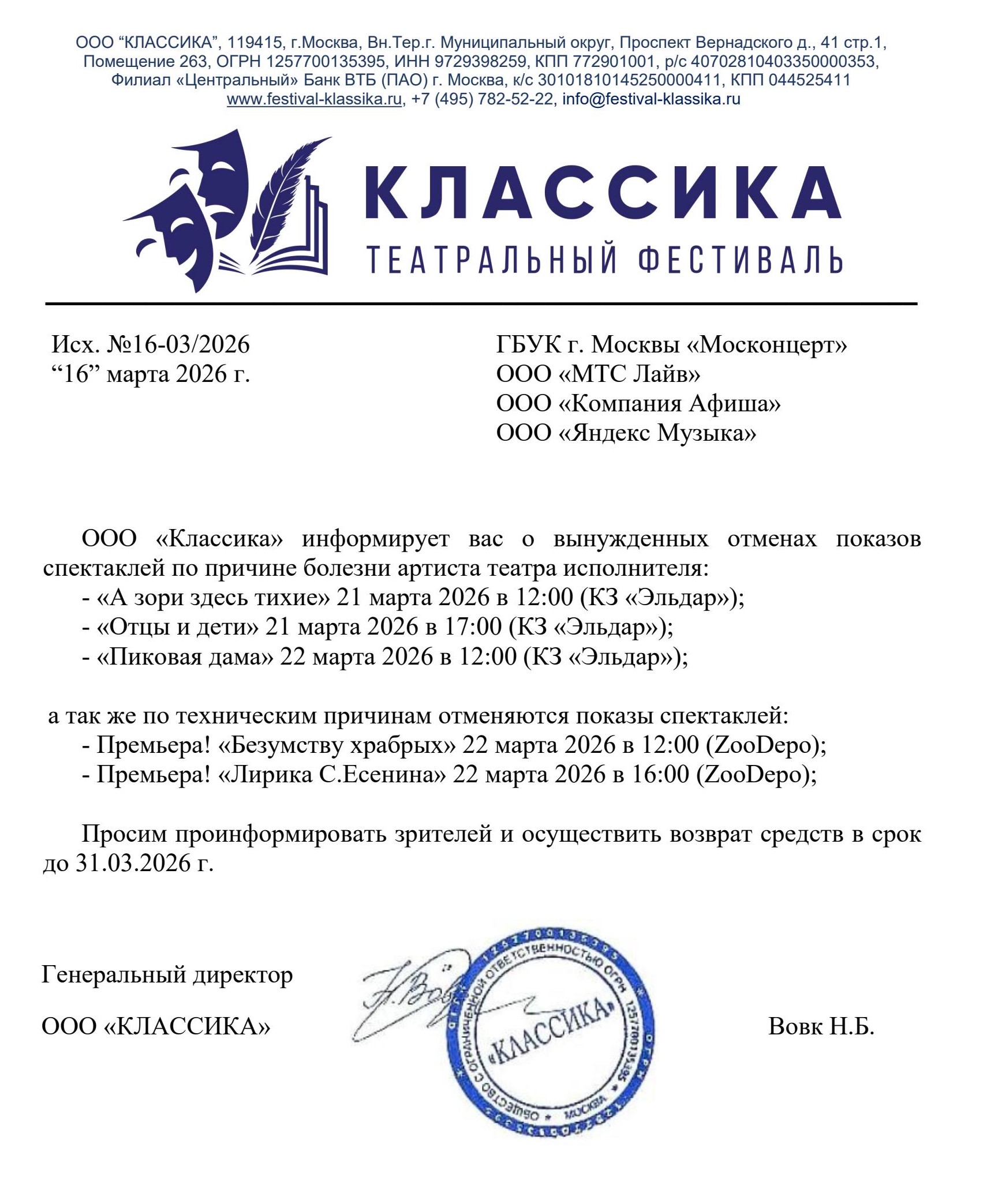 Уважаемый клиент! Спешим сообщить, что по информации, полученной от организатора, спектакль ««Лирика С. Есенина», запланированный на 22 марта 2026 года в 16:00 в Киноконцертном зале «ZooDepo», отменён. Деньги за электронные билеты вернутся автоматически в полном объёме на карту, с которой была произведена оплата. Если вы купили билет в кассе Ticketland.ru за наличный расчет, то обратитесь, пожалуйста, на почту: vozvrat@ticketland.ru. С уважением, команда поддержки Ticketland.