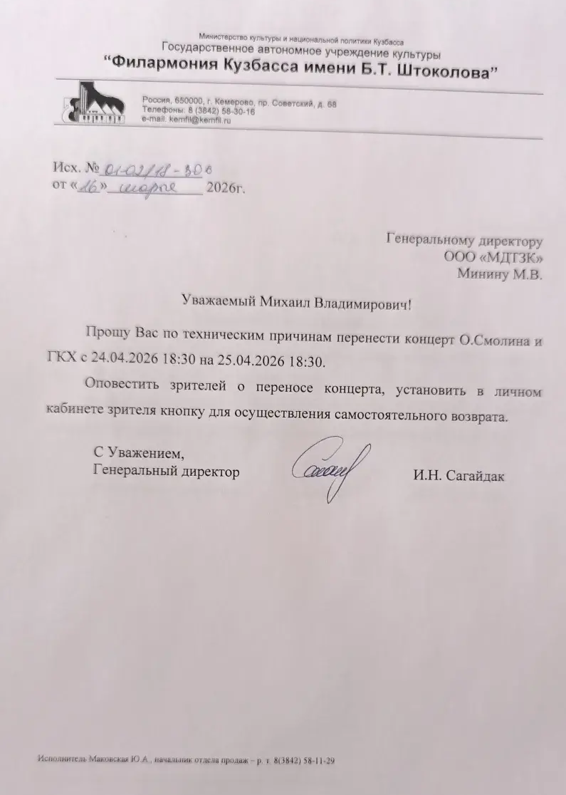 Уважаемый клиент! Спешим сообщить, что по информации, полученной от организатора, концерт О. Смолина и ГКХ, запланированный на 24 апреля 2026 года в 18:30 в Филармонии Кузбасса, перенесён на 25 апреля 2026 года, начало в 18:30. Ранее приобретенные билеты действительны на новую дату, обменивать их не нужно. Если вам не удобно посетить концерт в новую дату, вы можете вернуть билет по кнопке в личном кабинете во вкладке «Заказы» (до 24 апреля 2026 года до 18:30). Деньги за электронные билеты вернутся автоматически в полном объёме на карту, с которой была произведена оплата. Если вы купили билет в кассе Ticketland.ru за наличный расчет, то обратитесь, пожалуйста, на почту: vozvrat@ticketland.ru. С уважением, команда поддержки Ticketland.