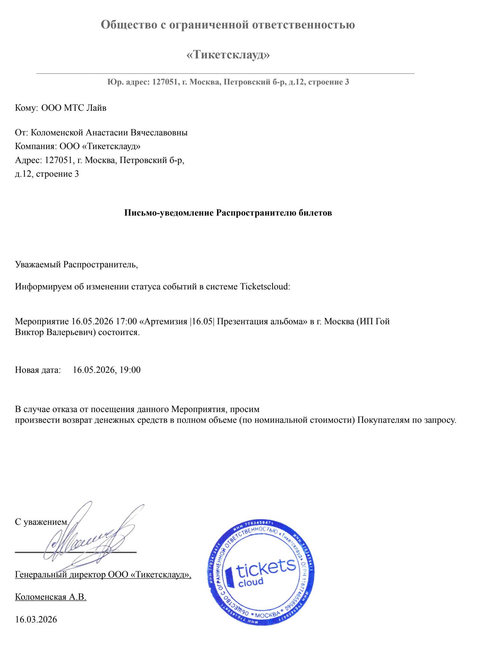 Уважаемый клиент! Спешим сообщить, что по информации, полученной от организатора, у концерта группы «Артемизия», запланированного на 16 мая 2026 года в 17:00 в Клубе «Mezzo Forte», изменено время начала на два часа вперёд. Верное время начала концерта - в 19:00. Ранее приобретенные билеты действительны на новое время, обменивать их не нужно. Если вам не удобно посетить концерт в новое время, вы можете вернуть билет по кнопке в личном кабинете во вкладке «Заказы». Деньги за электронные билеты вернутся автоматически в полном объёме на карту, с которой была произведена оплата. Если вы купили билет в кассе Ticketland.ru за наличный расчет, то обратитесь, пожалуйста, на почту: vozvrat@ticketland.ru. С уважением, команда поддержки Ticketland.