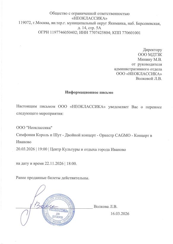Уважаемый клиент! Спешим сообщить, что по информации, полученной от организатора, двойной концерт «Оркестр CAGMO – Симфония Король и Шут», запланированный на 20 марта 2026 года в 19:00 в Центре Культуры и Отдыха, перенесён на 22 ноября 2026 года, начало в 18:00. Ранее приобретенные билеты действительны на новую дату, обменивать их не нужно. Если вам не удобно посетить концерт в новую дату, вы можете вернуть билет по кнопке в личном кабинете во вкладке «Заказы» (до 31 мая 2026 года включительно). Деньги за электронные билеты вернутся автоматически в полном объёме на карту, с которой была произведена оплата. Если вы купили билет в кассе Ticketland.ru за наличный расчет, то обратитесь, пожалуйста, на почту: vozvrat@ticketland.ru. С уважением, команда поддержки Ticketland.
