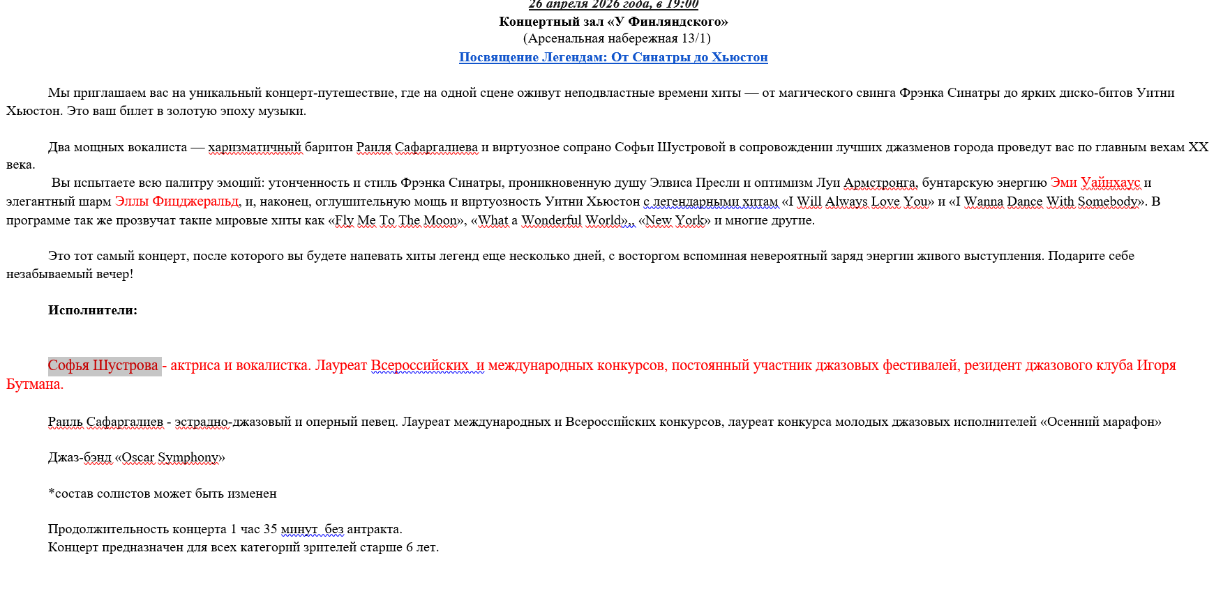 Уважаемый клиент! Спешим сообщить, что по информации, полученной от организатора, в программе концерта «Посвящение Легендам: От Синатры до Хьюстон», запланированный на 26 апреля 2026 года в 19:00 в КЗ «У Финляндского», произошли изменения. Новая программа во вложении. Ранее приобретенные билеты действительны, обменивать их не нужно. С уважением, команда поддержки Ticketland